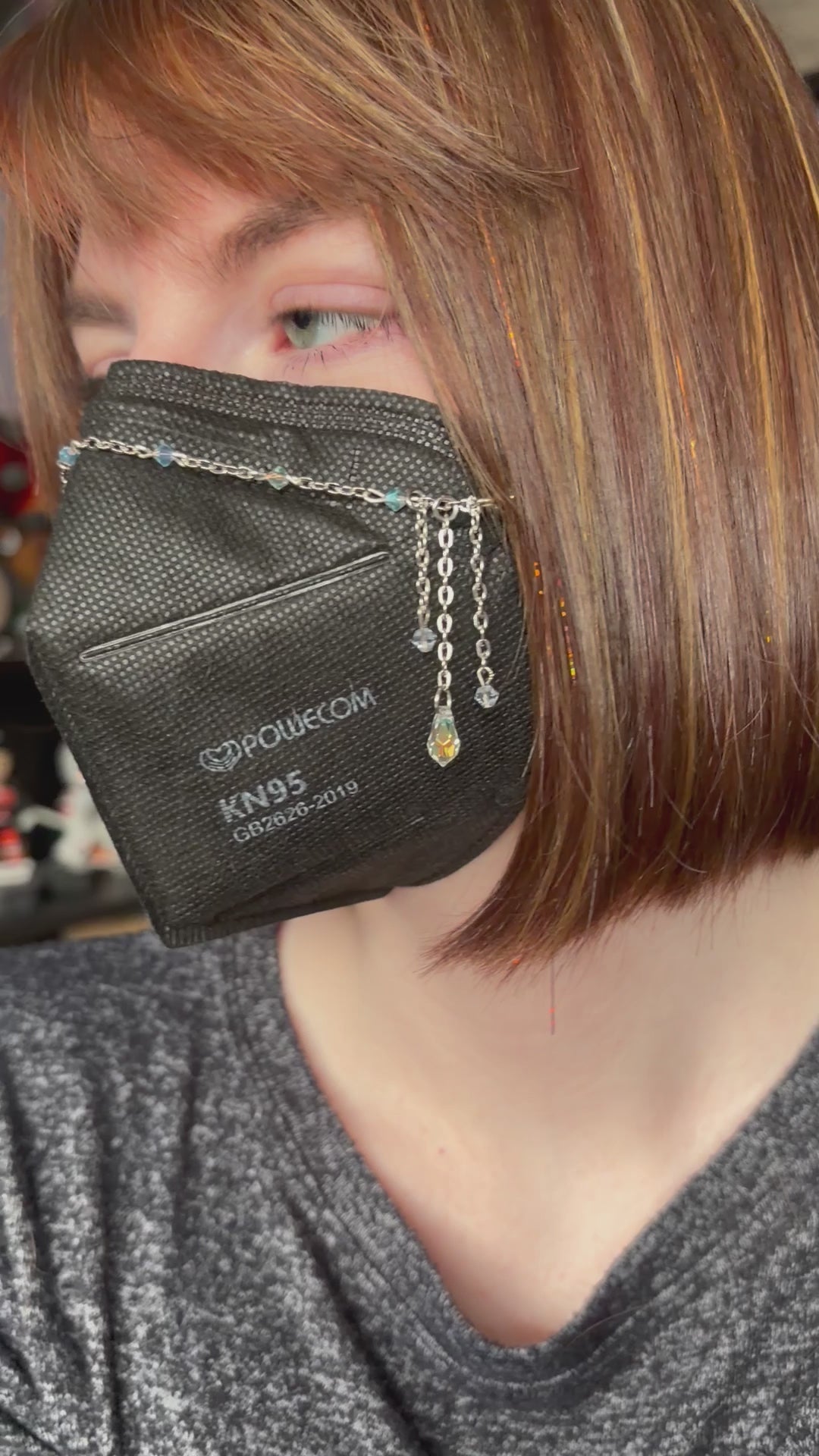 An 18k gold or silver plated stainless steel mask chain with preciosa crystals throughout, and 6 hanging! The two big drops are reflective and shine in the light.